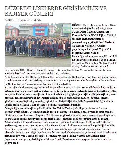 DÜZCE'DE LİSELERDE GİRİŞİMCİLİK VE KARİYER GÜNLERİ 18.04.2013Tahsin Tarhan Düzce'de Liselerde Girişimcilik ve Kariyer Günleri kapsamında, Yığılca çok Programlı Lise'de konuşmacı olarak yer aldı. http://www.haberflash.com/DUZCEDE-LISELERDE-GIRISIMCILIK-VE-KARIYER-GUNLERI-76293.html